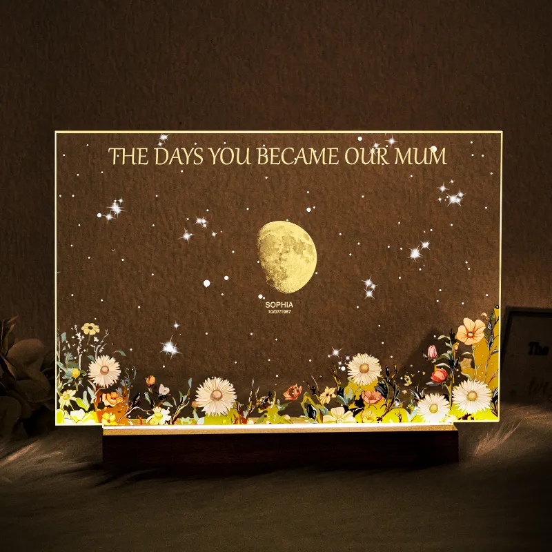 Celebrate the most precious moments of motherhood with our Personalized "The Days You Became Our Mom" Moon Phase Lightbox. This stunning custom lightbox beautifully displays the exact moon phases from the days each child was born, making it a heartfelt and unique tribute to a mother’s journey. The soft, warm glow serves as a constant reminder of love, joy, and the unforgettable moments of becoming a mom.